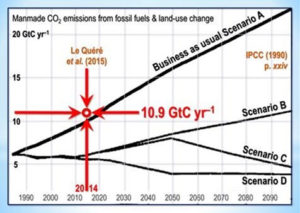 Man kann darüber streiten, ob die wirkliche Rate der Zunahme von Emissionen wirklich so gering wie 0,1 Milliarden Tonnen Kohlenstoff pro Jahr ist angesichts des Umstandes, dass China und jetzt auch Indien Kohlekraftwerke mit einer rekordhohen Rate ans Netz bringen. Aber die offizielle Vorgabe lautet, dass die Emissionen fast aufgehört haben zuzunehmen. Nichtsdestotrotz liegen die Emissionen noch weit über jedweden, vom IPCC angegebenen Stabilisierungs-Szenarien.