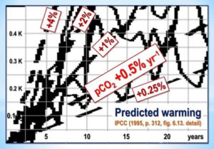 Im Jahre 1995 nannte das IPCC eine Prophezeiung der Erwärmungsraten, die man als Reaktion auf verschiedene Raten der Zunahme der CO2-Konzentration erwarten könne. Die auf der Grundlage der aktuellen Rate erfolgte Prophezeiung wird hervorgehoben: