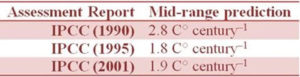 Tabelle 1 fasst diese mittelfristigen prophezeiten globalen Erwärmungsraten aus den ersten drei Zustandsberichten zusammen: