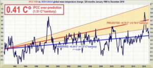 Zieht man das Mittel der Datensätze von RSS und UAH heran zeigt sich, dass die langzeitliche Erwärmungsrate während des gesamten Zeitraumes von 39 Jahren seit 1979 bei lediglich 1,3°C pro Jahrhundert lag, was weniger als halb so groß ist wie die IPCC-Prophezeiung aus dem Jahr 1990: