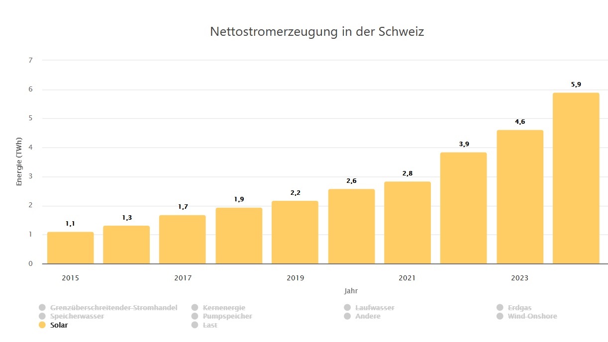 2017 waren das noch 1,7 TWh PV-Strom in der Schweiz und 2024 bereits 5,9 TWh.