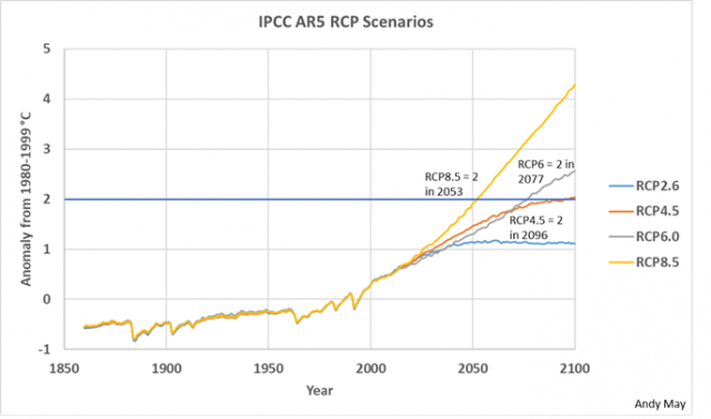 RCP („Representative Concentration Pathway”) ist eine Bezeichnung, die man einem Satz von Klimamodell-Parametern gegeben hat. In diesen Parametern sind prophezeite Treibhausgas-Emissionen enthalten, ebenso wie Hypothesen, wie sensitiv das Klima auf jene Emissionen reagiert. In diesem Fall hier ist das RCP2.6-Szenario ein „sicherer“ Satz von Hypothesen, weshalb wir annehmen, dass die Erwärmung unter diesem Szenario keine Schäden verursachen wird und den Temperaturanstieg auf 1,1°C über die Mitteltemperatur des Zeitraumes 1980 bis 1999 begrenzt. RCP8.5 ist ein ziemlich radikaler „Worst Case“, und unter diesem Satz von Parametern wird die Temperatur bereits im Jahre 2053 um 2°C gestiegen sein. Für den Moment wollen wir uns auf das RCP4.5-Szenario konzentrieren, wie es auch die meisten Analysten tun. In diesem Szenario wird die um „gefährliche“ 2°C höhere Temperatur im Jahre 2096 erreicht.