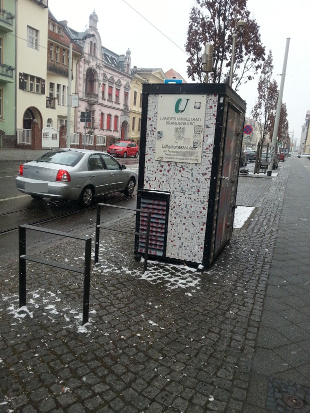 In Cottbus steht eine Luftmessstation in der Bahnhofstraße vor Haus Nummer 56. Diese Straße ist eine der wichtigsten Nord-Süd Verbindungen mit teilweise prächtigen Bürgerhäusern aus der Jahrhundertwende.
