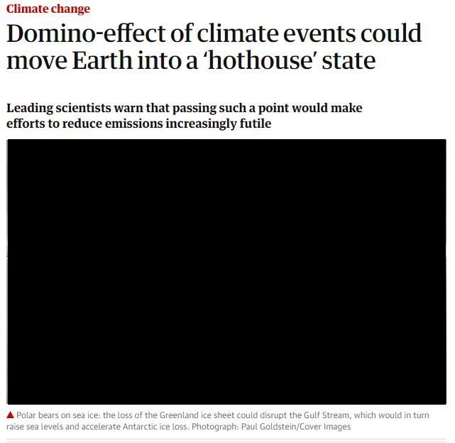 Bildinschrift [von oben]: Klimawandel: Domino-Effekt von Klima-Ereignissen könnte die Erde in ein ,Heiß-Haus‘-Stadium bringen.
