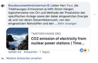 In dieser Woche legte das Volk den Öffentlichkeitsarbeitern des Umweltministeriums unter anderem nahe, mal die einschlägigen Studien zum Thema zu lesen – darunter auch auf der Ministeriums-Webseite verlinkte. Diese Studien kommen nämlich, wie auch die sonstige Fachliteratur, übereinstimmend zu dem Schluss, dass Atomstrom keine CO2-Direktemissionen bewirkt. Mit Bezug auf die gesamte Produktionskette vom Uranabbau bis zur Steckdose steht Strom aus Kernkraftwerken ähnlich gut da wie Windstrom und wesentlich besser als Solarstrom (nachzulesen auf Englisch hier S.7, oder gut verständlich in deutscher Sprache hier). Weil die Kernenergie einen ähnlichen carbon footprint aufweist wie Erneuerbaren, wird sie vom Weltklimarat IPCC folgerichtig als eines der Instrumente für die Defossilisierung der Energiewirtschaft genannt – eine Tatsache, die das BMU lieber nicht so genau zur Kenntnis nehmen mag.