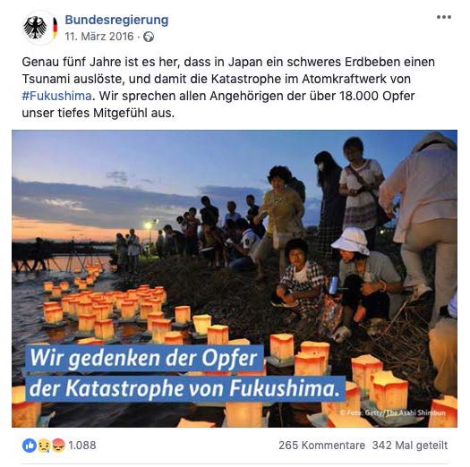 Und das war nicht der erste. Denn die Bundesregierung ist bereits in der Vergangenheit mit kuriosen Eigenfakten auffällig geworden, so im Jahr 2016 mit einer Facebook-Traueranzeige über die 18.000 Opfer des Reaktorunfalls von Fukushima, die in Wirklichkeit beim Großen Tohoku-Seebeben vom 11. März 2011 und dem darauffolgenden Tsunami umkamen.