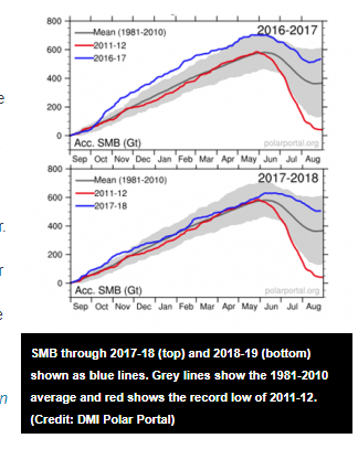 Es ist nicht Das Grönland-Eis (bei tgwpf „Greenland Ice sheet“) sondern die Massenbilanz der Eisoberfläche (Surface Mass Balance SMB), die dieses Jahr wieder deutlich über dem Mittelwert liegt. Von dieser SMB ist der Eis-Massenverlust durch basales Schmelzen und durch das Kalben der Gletscher abzuziehen. Im Artikel steht das ja auch explizit drin: