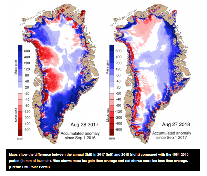Die Karten zeigen den Unterschied zwischen dem jährlichen SMB im Jahre 2017 (links) und 2018 (rechts) im Vergleich mit der Periode 1981 bis 2010 (in mm Eisschmelze). Blaue Flächen kennzeichnen mehr Eiszuwachs als im Mittel, rote Flächen kennzeichnen mehr Eisverlust als -zuwachs (Quelle: DMI Polar Portal).