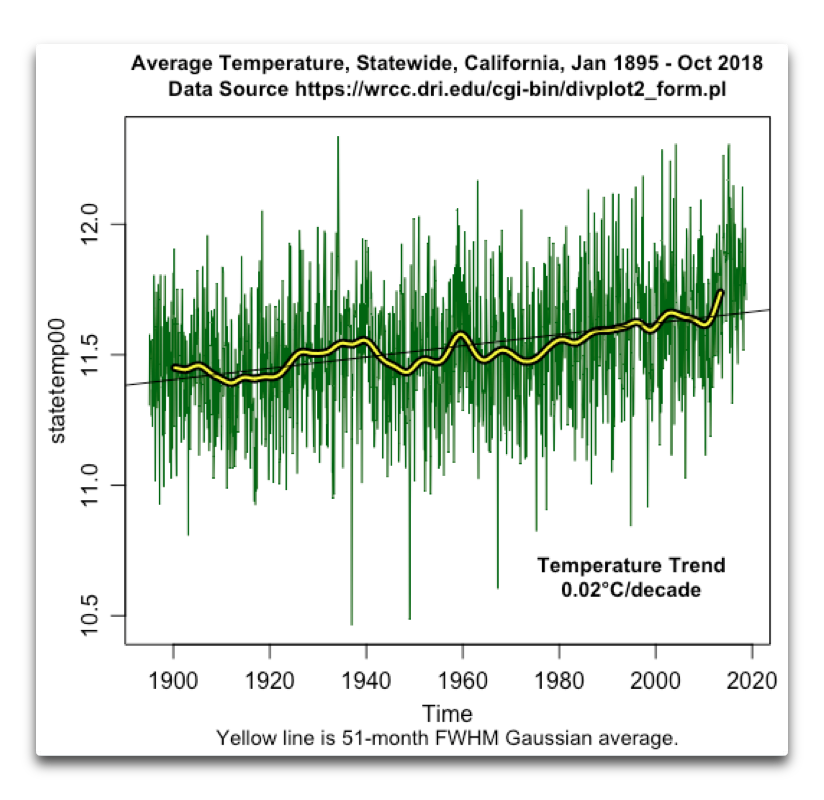 Nun also … haben Wissenschaftler tatsächlich „prophezeit“, dass die Temperaturen in der Vergangenheit um 1 Grad gestiegen sind? Können Wissenschaftler wirklich die Vergangenheit prophezeien? Und können wir wirklich ein halbes Grad Erwärmung im nächsten Jahrzehnt erwarten? Um hierüber Aufschluss zu bekommen, schaute ich genauer auf die Aufzeichnungen. Ich fand eine interessante Website, nämlich die vom Western Regional Climate Center (WRCC), wo man eine Vielfalt von wetterbezogenen Daten für einzelne Staaten hat. Also ohne weitere Umschweife – hier die mittlere Temperatur in Kalifornien von 1895 bis zur Gegenwart, Oktober 2018:
