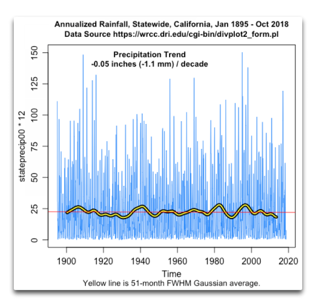 Abbildung 2: Jährlich aufgetragene monatliche Regenmenge in Kalifornien laut WRCC. Da die Regenmengen-Daten in Inches pro Jahr angegeben werden und nicht pro Monat, habe ich alle Werte mit 12 multipliziert, um den Trend in den Daten zu einem Jahrestrend zu