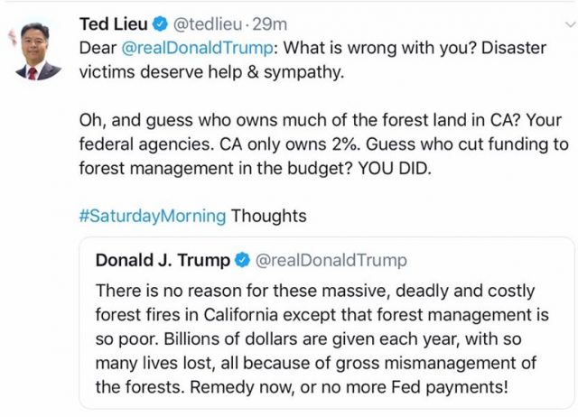 Aber Moment, laut Fernsehberichten ist da noch etwas … beide Feuer der jüngsten Zeit, nämlich das Camp Fire in Paradise und das Woolsey Fire in Thousand Oaks, ist in Wäldern im Privatbesitz ausgebrochen. Das bedeutet, dass die [US-]Bundesregierung nichts mit den Vorschriften zu tun hatte, welche zu diesen Bränden führten.