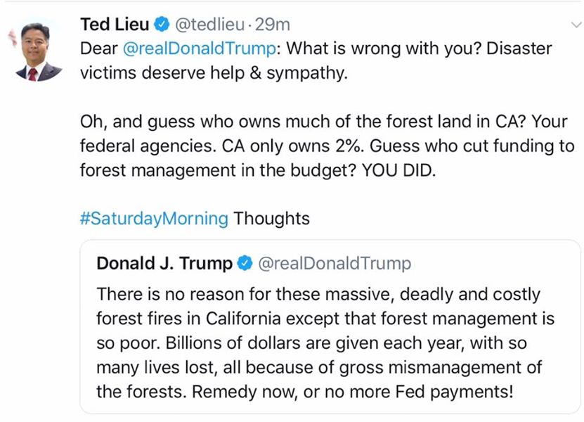 Inzwischen kursiert im Internet ein Memo des Inhalts, dass Präsident Trump fälschlich den Staat [Kalifornien] verantwortlich macht, weil dem Memo zufolge 98% der Wälder in Kalifornien der Nation [= den USA] gehören und nur 2% davon dem Staat Kalifornien. Nichts könnte weiter von der Wahrheit entfernt sein.