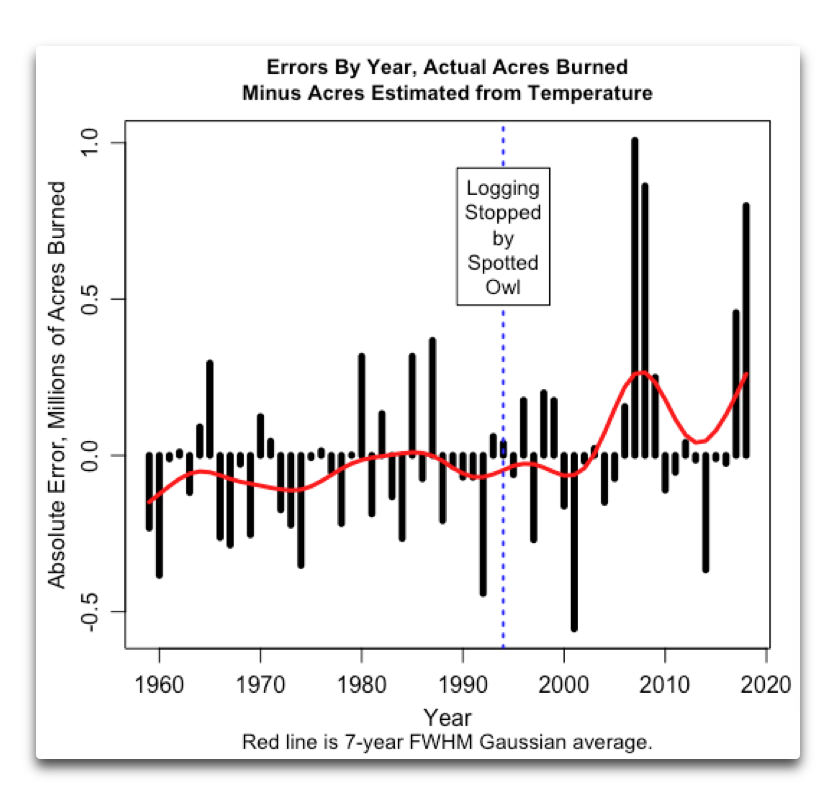 Abbildung 3: Fehler in den Schätzungen der verbrannten Fläche nach Jahren, 1959 bis 2018, minus der verbrannten Fläche geschätzt aus den Variationen der Temperatur von Mai bis Oktober. Die rote Linie markiert eine volle Halbwertsbreite [Full-Width Half Maximum {FHWM}?] einer Gauss-Verteilung der Daten. Die vertikale gepunktete blaue Linie markiert das Jahr 1994, als die Bewirtschaftung des Waldes in weiten Teilen des Staates [Kalifornien] gestoppt wurde, und zwar in dem vergeblichen Versuch, den Fleckenkauz zu schützen.