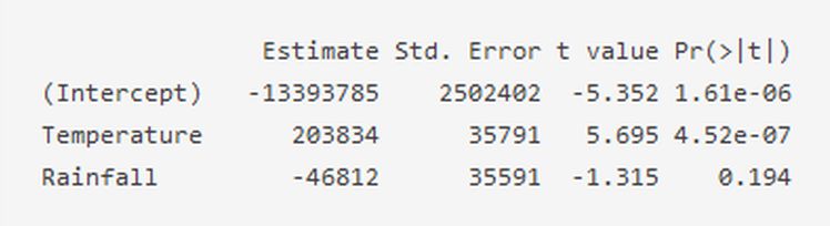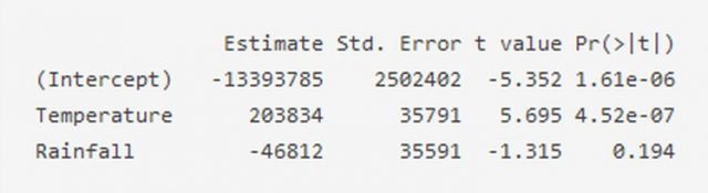 Die Temperatur ist signifikant (rechte Spalte, p-Wert 4.52e-7), aber die Regenmenge ist alles andere als signifikant (p-Wert = .19). Daher ignorierte ich die Regenmenge für die weitere Analyse.