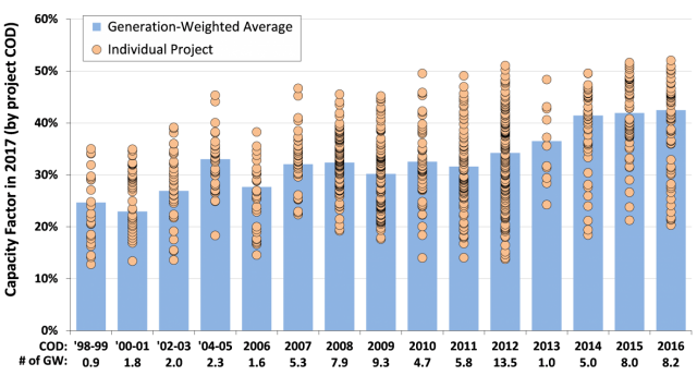 Die durchschnittliche „spezifische Leistung“ pro Quadratmeter Rotorfläche reduzierte sich damit von 395 Watt der in den Jahren 1998-1999 installierten Projekte, auf 231 W / m2 der ab 2017 installierten Projekte.