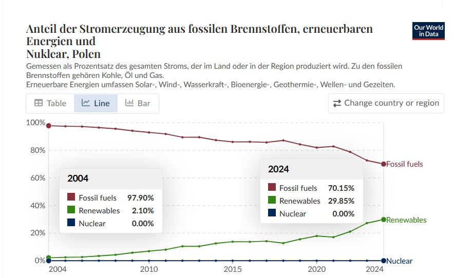 Diese Richtlinien sind sehr allgemein und können nicht jede mögliche Situation abdecken. Nehmen Sie deshalb bitte nicht an, dass das EIKE Management mit Ihnen übereinstimmt oder sonst Ihre Anmerkungen gutheißt. Wir behalten uns jederzeit das Recht vor, Anmerkungen zu filtern oder zu löschen oder zu bestreiten und dies ganz allein nach unserem Gutdünken. Wenn Sie finden, dass Ihre Anmerkung unpassend gefiltert wurde, schicken Sie uns bitte eine Mail über "Über Uns->Kontakt"Auch im Polen ist der Strom aus den fossilen von ca. 98% auf 70% zurückgegangen