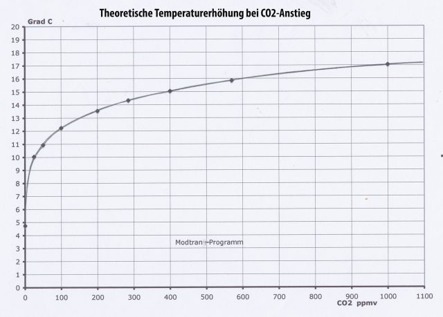 Das international anerkannte Modtran-Programm der Atmosphärenphysik zeigt zwischen 400 und 800 ppm einen Temperaturanstieg von nur 1,7°C (anstelle von den 3°C des IPCC) mit Berücksichtigung des Sättigungseffektes, der ansonsten oft ignoriert wird. Das wäre dann in 100 Jahren nur ein Anstieg um ca. +0,85°C.