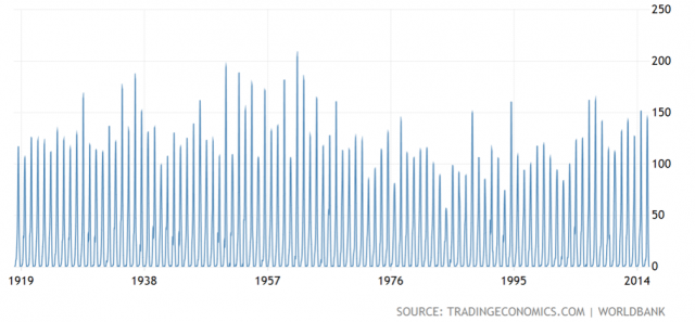 Bild 3 Niederschlagsverlauf Tschad 1919 – 2014. Quelle: tradingeeconimics