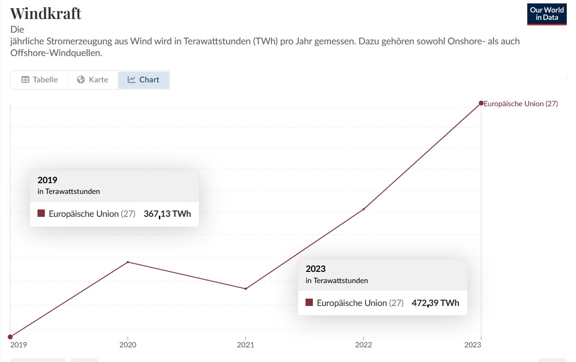 Diese Richtlinien sind sehr allgemein und können nicht jede mögliche Situation abdecken. Nehmen Sie deshalb bitte nicht an, dass das EIKE Management mit Ihnen übereinstimmt oder sonst Ihre Anmerkungen gutheißt. Wir behalten uns jederzeit das Recht vor, Anmerkungen zu filtern oder zu löschen oder zu bestreiten und dies ganz allein nach unserem Gutdünken. Wenn Sie finden, dass Ihre Anmerkung unpassend gefiltert wurde, schicken Sie uns bitte eine Mail über "Über Uns->Kontakt"Ein Anstieg von +99TWh (um ca. +26%) beim Windstrom in der haben Europäischen Union in nur 4 Jahre ist doch eine Erfolgsgeschichte.