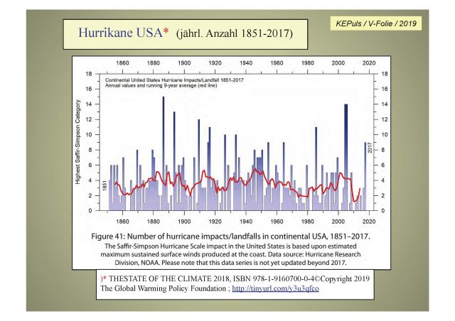 „The number of hurricane landfalls in the continental United States is shown in Figure 41. Over the observational period, this data series shows considerable variations from year to year, but it is not possible to detect any clear trend over time.“