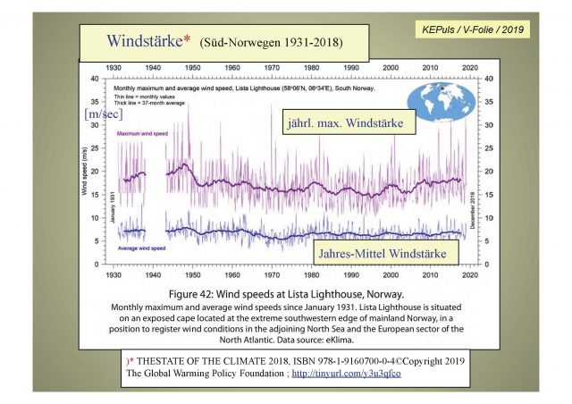 „One example from north-west Europe is Lista Lighthouse, which sits on an exposed cape at the extreme southwestern edge of the mainland of Norway. It is thus well suited to register wind conditions in the adjoining North Sea and the European sector of the North Atlantic.… The peak wind strengths were recorded shortly after World War II, and strengths have since declined somewhat.“