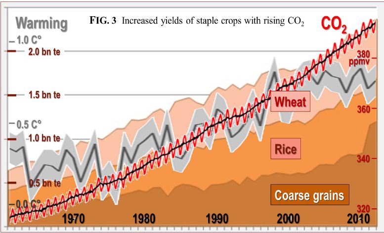 Gute Nachrichten! Es gibt keinen Grund für Klima-Bedenken. Eine grundlegende Studie von Klimaforschern, welche gegenwärtig den Begutachtungsprozess bei einem führenden Klima-Journal durchläuft, beweist, dass die globale Erwärmung bei einer CO2-Verdoppelung nicht 3,35 K betragen wird, wie es die Modellsimulationen hergeben, sondern lediglich 1,15 K (Abbildung 1). Klimawissenschaftler haben an einer entscheidenden Stelle ihrer Berechnungen einfach außen vor gelassen, dass die Sonne scheint. Dieser große physikalische Fehler ließ sie eine um das Dreifache zu hohe, vom Menschen verursachte globale Erwärmung prophezeien. Sie haben die aus der Ingenieurs-Physik abgeleitete Mathematik falsch verstanden. Korrigiert man diese Fehler, wird deutlich, dass die globale Erwärmung insgesamt vorteilhaft ist und auch künftig sein wird. Vorteile werden beispielsweise Steigerungen der Erntemenge sein (Abbildungen 2 und 3) sowie eine größere Widerstandskraft gegen Dürre infolge des CO2-Düngungseffektes. Bereits während der letzten Jahrzehnte hat die Biomasse grüner Pflanzen um 15% bis 30% zugenommen (Abbildung 4). Selbst mit der Erwärmung wird die Anzahl vermiedener Todesfälle durch Reduktion von Kälte über die Todesfälle durch Hitze hinausgehen (Abbildung 5). Es gibt keine wissenschaftliche Grundlage für die von den Klimatologen prophezeite Erwärmung um 34,35°C; 4,7°C (Abbildung 6) oder gar 10°C.