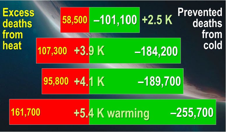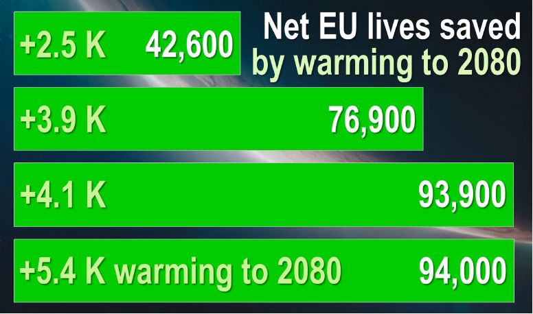 Allerdings zeigt unsere eigene Forschung, dass die bis Ende dieses Jahrhunderts zu erwartende Erwärmung nicht 3 K, sondern wahrscheinlich 1 K betragen wird. Das bedeutet eine Erwärmungsrate von 0,1 K pro Dekade, was in sehr guter Übereinstimmung mit der Beobachtung steht. Und diese Rate ist viel zu gering, um überhaupt irgendwie schädlich zu sein. Tatsächlich ist die EU-Kommission selbst auf der Grundlage einer Erwärmung um 5,4 K schon bis zum Jahr 2080 durch eigene Forschungen zu dem Ergebnis gekommen, dass die vermiedenen Todesfälle durch eine geringere Anzahl von Kältewellen die Todesfälle durch zunehmende Hitzewellen weit überkompensiert. Kurz gesagt, die wirtschaftlichen ebenso wie die sozialen Vorteile, wenn man der Atmosphäre einen kleinen Bruchteil der Konzentration zurück gibt, welcher während der Zeit des Kambriums vorherrschend war, werden die (großenteils imaginären) Nachteile weit überkompensieren.