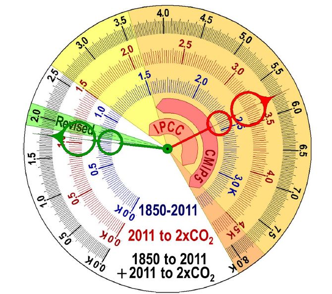 Abbildung 6: Die offiziell projizierte globale Erwärmung (rote Nadel) ist dreimal so hoch wie die beobachtete Erwärmung in der realen Welt (grüne Nadel). Sich überlappende Projektionen von IPCC (2013) und CMIP5 (Andrews et al. 2012) der globalen Erwärmung von 1850 bis 2011 (blaue Skala) als Reaktion auf eine CO2-Verdoppelung (dunkelrote Skala) sowie die Summe von beiden (schwarze Skala) gehen weit über das beobachtete Erwärmungs-Äquivalent von 0,75 K von 1850 bis 2011 hinaus (HadCRUT4). Die Schätzung der Charney-Sensitivität nach CMIP5 von 3,35 K impliziert eine anthropogene Erwärmung um 2,4 K bis zum Jahre 2011, also das Dreifache der Beobachtung. Das von Monckton of Brenchley et al. (2019) überarbeitete Intervall der Erwärmung (hellgrüne Region) ist konsistent mit der beobachteten Erwärmung bis zum Jahre 2011. Es war diese dreifache Diskrepanz zwischen übertriebener Prophezeiung und beobachteter Realität – eine Diskrepanz, die aus irgendwelchen Gründen nirgendwo Erwähnung findet – hat das Team veranlasst, die Gründe zu erforschen, warum Klimamodelle viel zu viel globale Erwärmung simulieren.