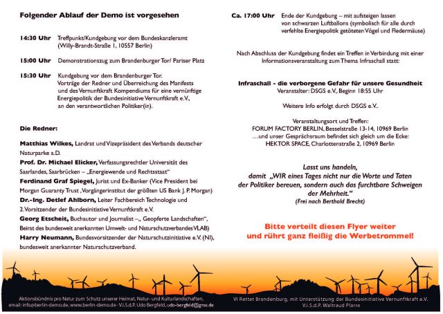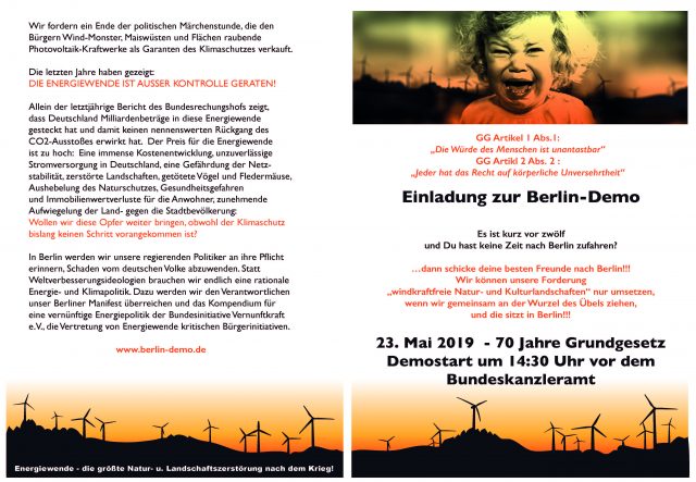 Deswegen würde ich mich freuen, Sie am 23.05.in Berlin, begrüßen zu dürfen, um gemeinsam gegen die Windindustrie und eine Menschen und Natur verachtenden Energie- und Klimapolitik zu protestieren.