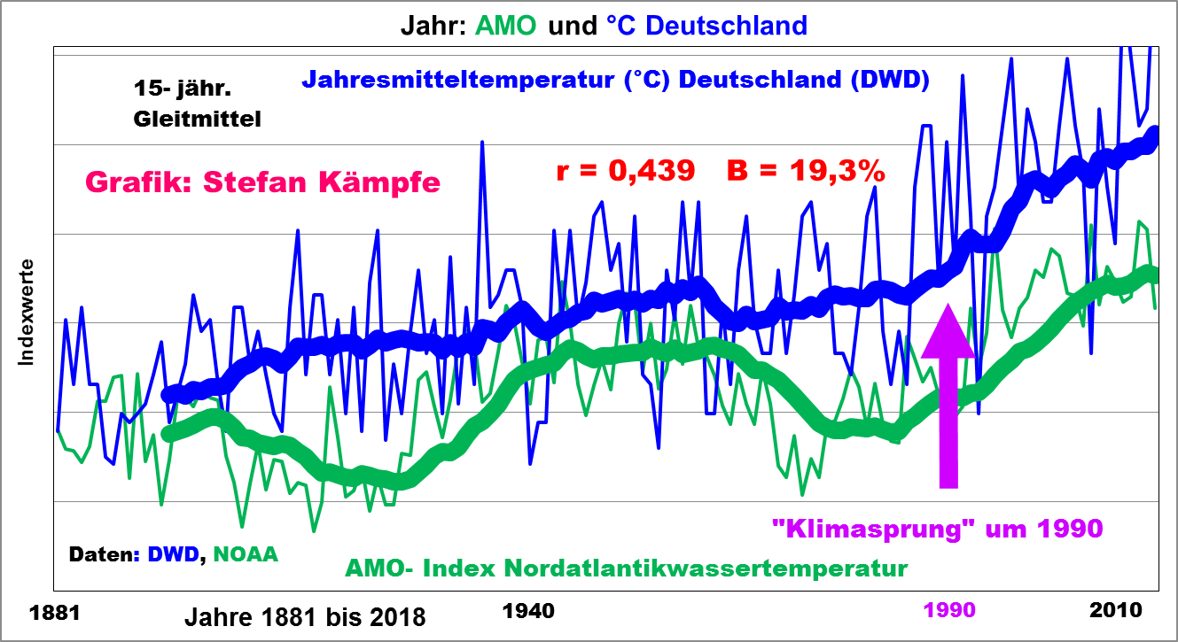 Eine zweite, wesentliche Einflussgröße auf unser Klima ist die so genannte AMO (AMO = Atlantische Mehrzehnjährige Oszillation, ein Index für die gemittelten Meeresoberflächentemperaturen im zentralen Nordatlantik). Sie weist eine etwa 60ig- bis 80ig-jährige Rhythmik auf und hatte im späten 20. und frühen 21. Jahrhundert ihr Maximum („Warmphase“):
