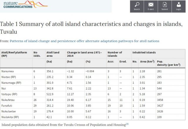 Es gibt nur ein Problem, wissenschaftliche Studien der Tuvalu Inseln zeigen, dass die meisten pazifischen Inseln, im Gegenteil trotz behauptetem Anstiegs des Meeresspiegels gewachsen sind.