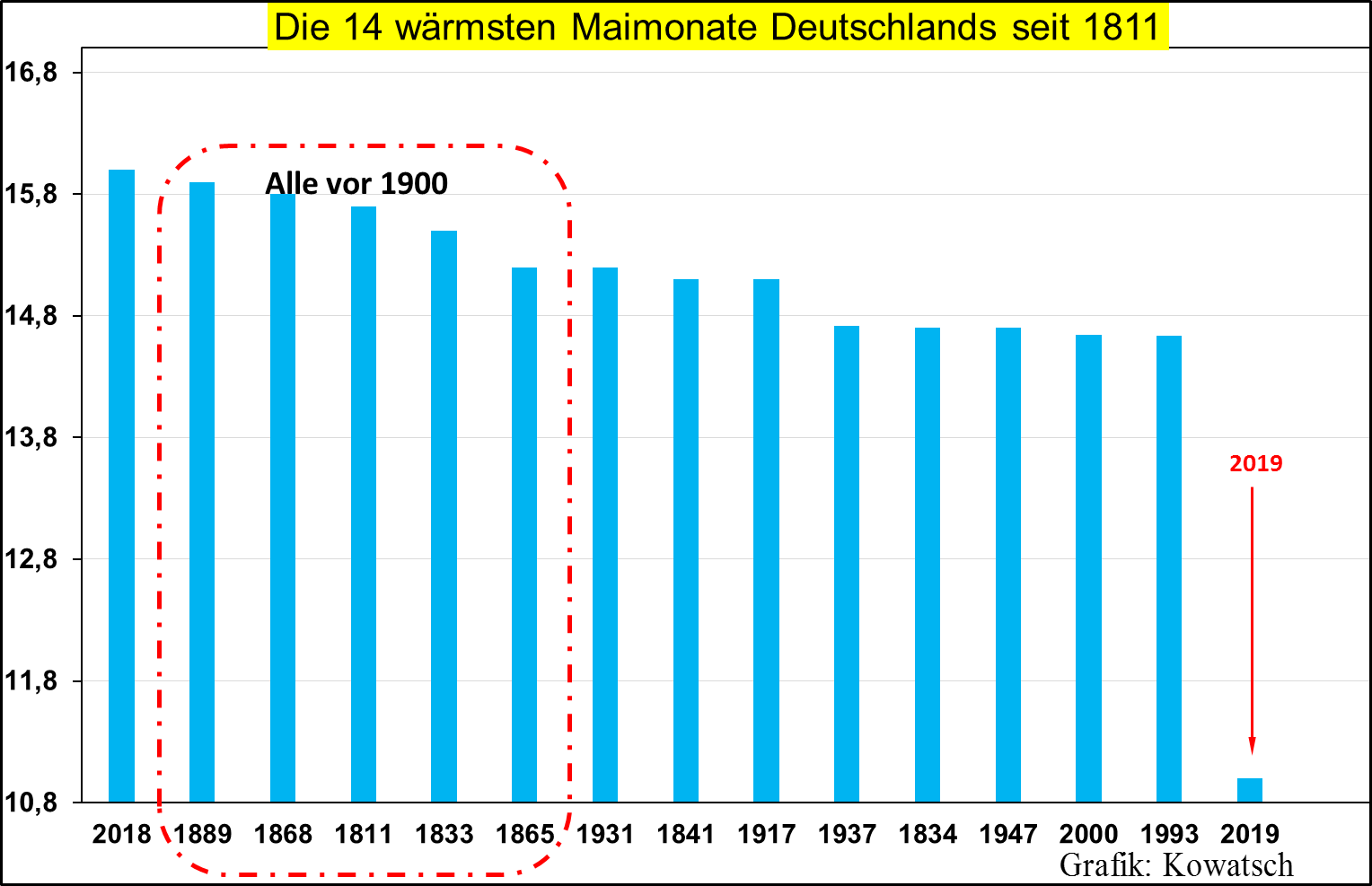 Grafik 1: Unser Dichter Johann Wolfgang Goethe lebte noch zu den Zeiten des viertwärmsten Maimonats (1811) in Deutschland. Der Mai 2019 ist keineswegs an 15. Stelle, er wurde auf dieser Grafik nur im Vergleich zu den 14 wärmsten eingezeichnet.