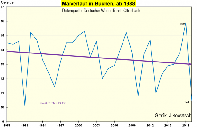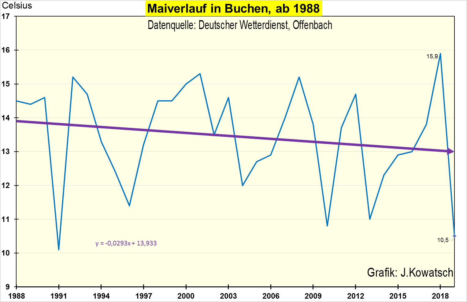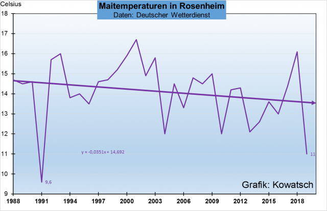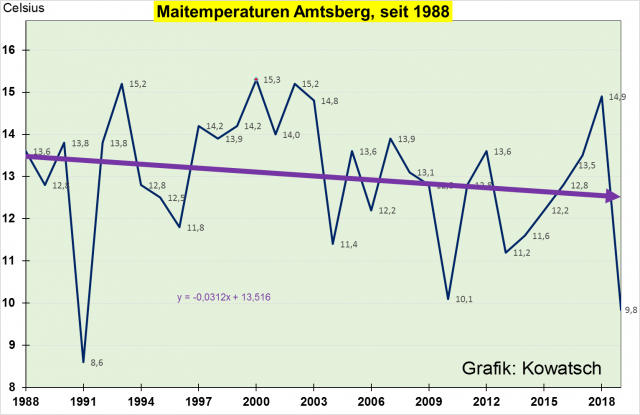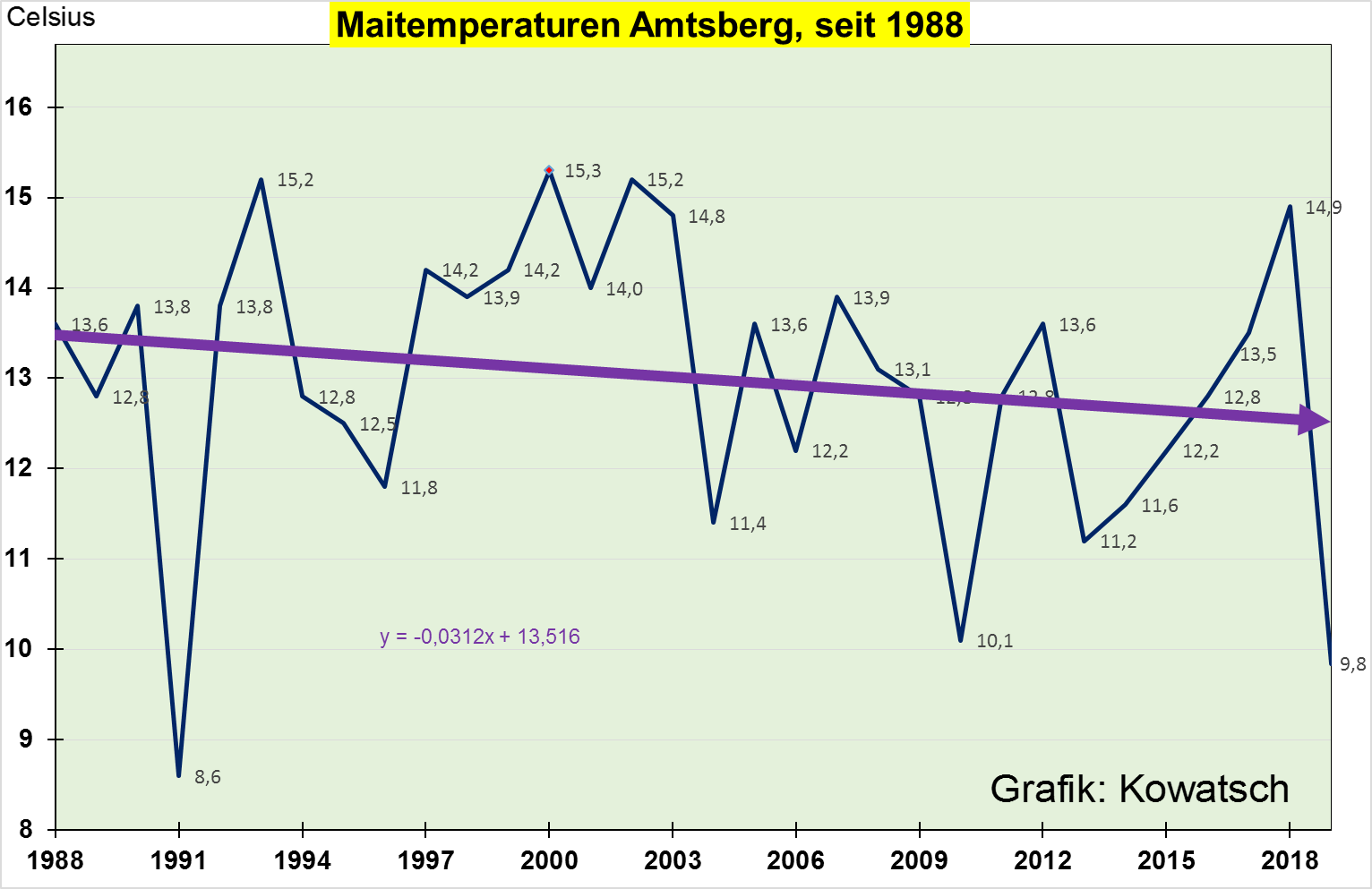 In der freien Fläche Deutschlands, das sind nahezu 90% der Gesamtfläche, also außerhalb der wärmenden Städte und Ansiedlungen ist in den letzten 30 Jahren der Wonnemonat Mai deutlich kälter geworden. Die Fichten im deutschen Wald sterben nicht wegen einer behaupteten Klimaerwärmung, sondern eher wegen der Kälte der Eisheiligen. Insbesondere gilt diese Feststellung für die Eschen als wärmeliebender Baum.