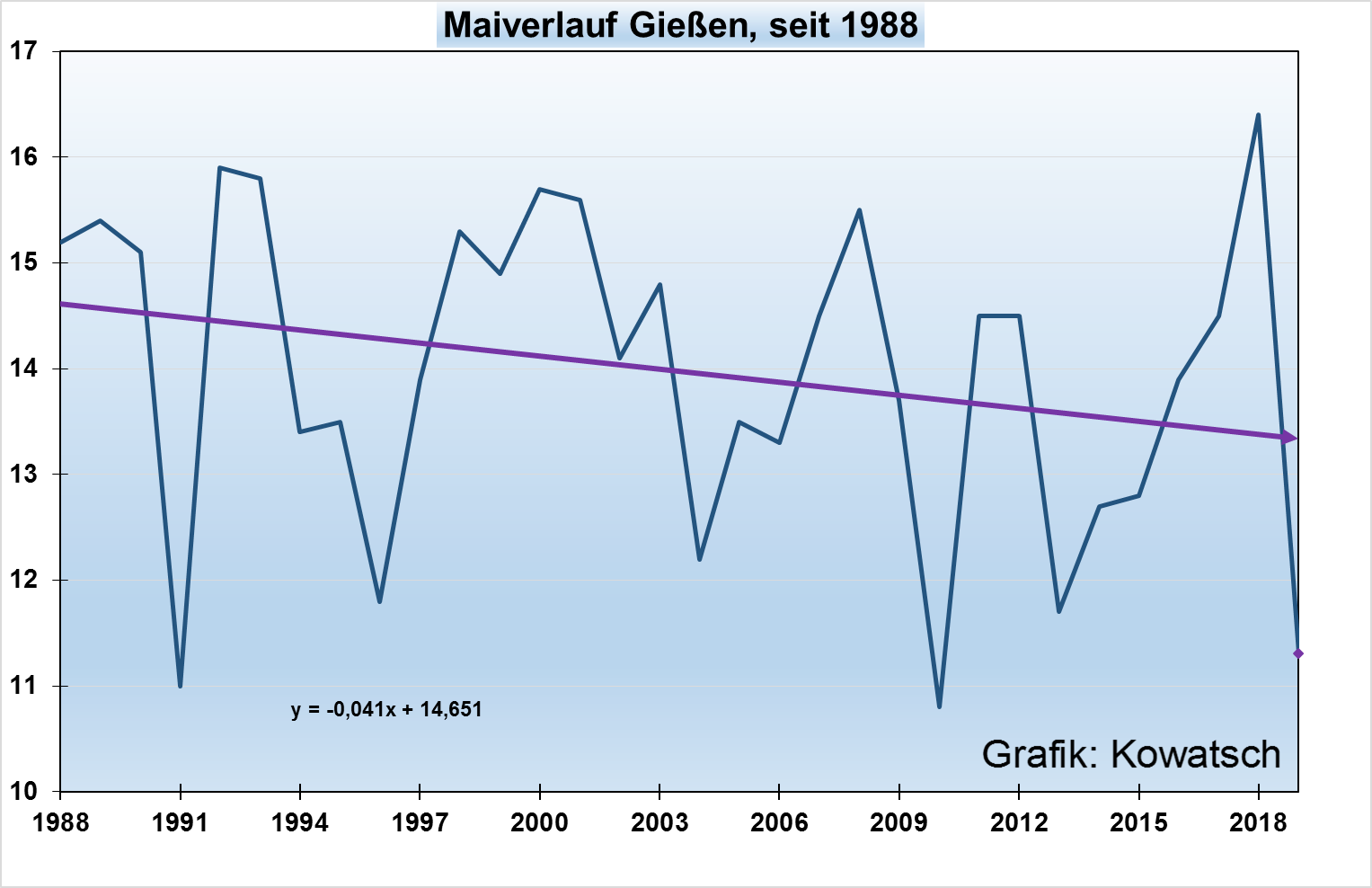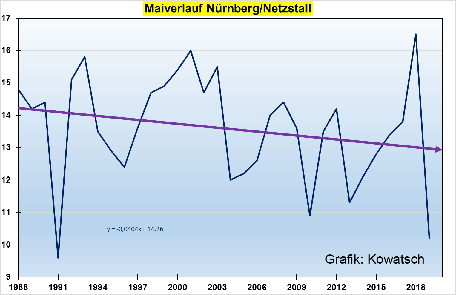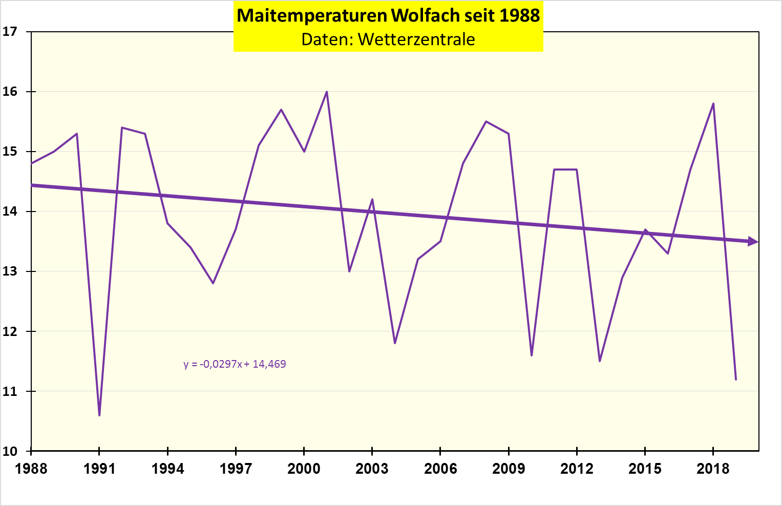 In der freien Fläche Deutschlands, das sind nahezu 90% der Gesamtfläche, also außerhalb der wärmenden Städte und Ansiedlungen ist in den letzten 30 Jahren der Wonnemonat Mai deutlich kälter geworden. Die Fichten im deutschen Wald sterben nicht wegen einer behaupteten Klimaerwärmung, sondern eher wegen der Kälte der Eisheiligen. Insbesondere gilt diese Feststellung für die Eschen als wärmeliebender Baum.