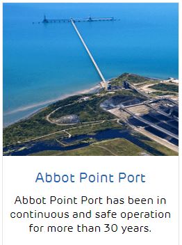 Bild von der Firmenwebseite Adani Australia, Frachthafen vor dem Barrier Reef gelegen und über Förderbänder bedient. Endpunkt der geplanten Eisenbahn.