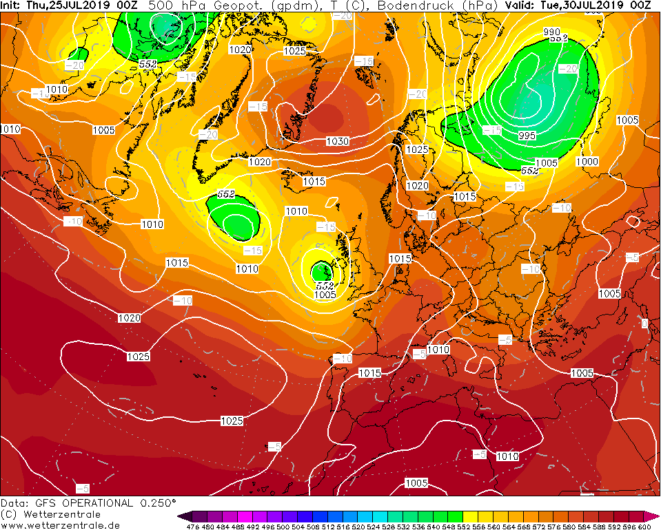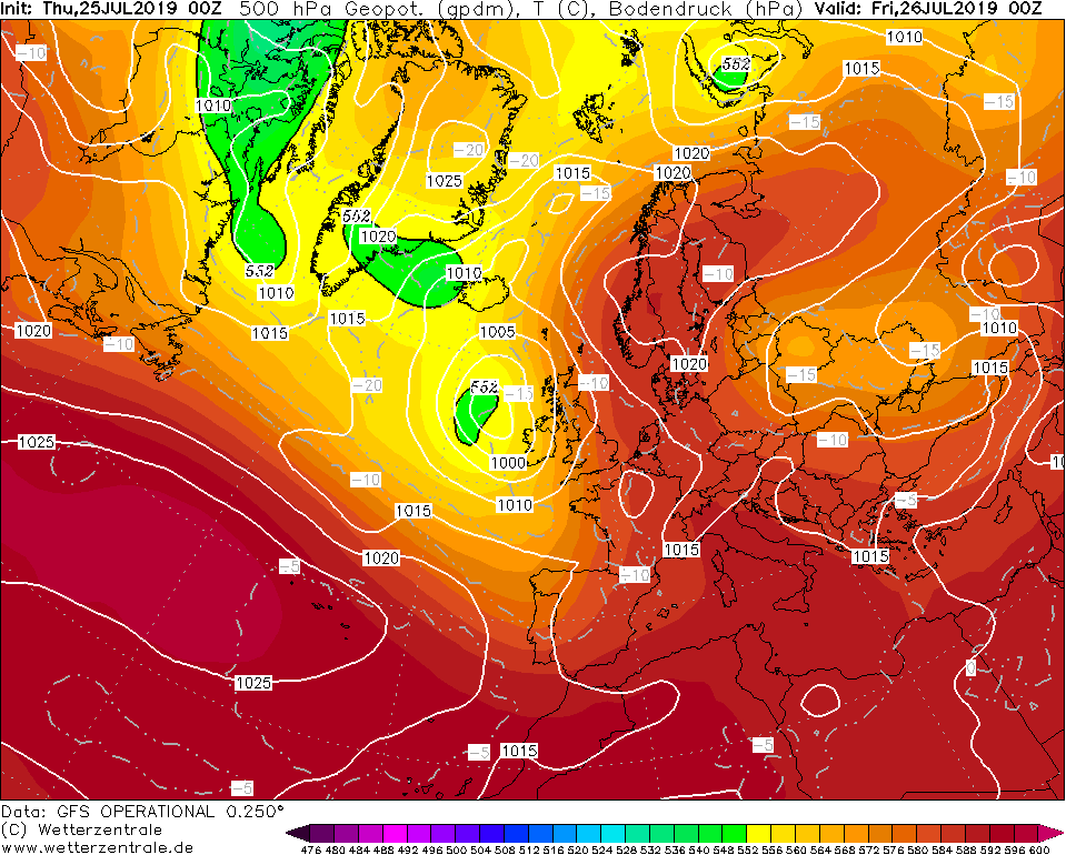Abbildung 1: Geopotential im 500-hPa-Niveau (farbig) und Bodendruck (weiße Linien) von Freitag dem 26.7.2019, 00 UTC (= 02 Uhr MESZ)