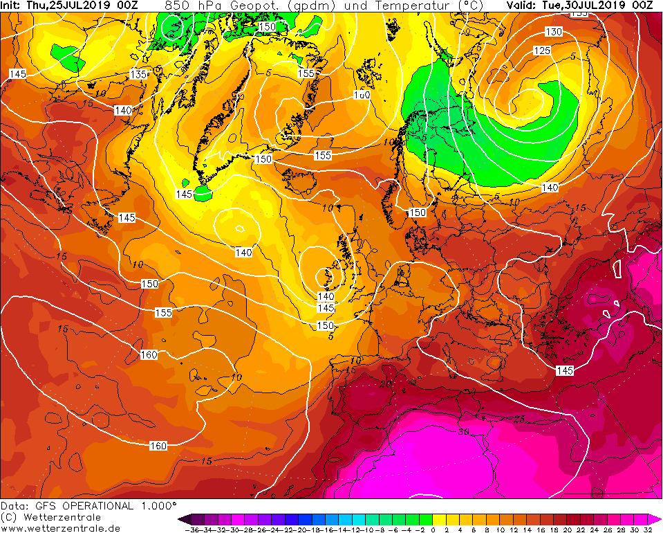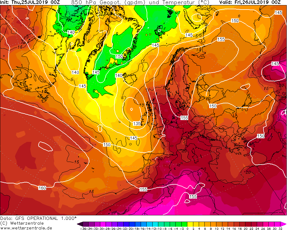 Abbildung 2: Temperaturverteilung im 850-hPa-Niveau (farbig) und Höhenlinien der 850-hPa-Fläche über NN (Die Bezifferung 155 über Norddeutschland bedeutet, dass entlang der hindurch laufenden Linie der Luftdruck in 1550 m ü. NN genau 850 hPa beträgt. Die Bezifferung 135 über dem Ostatlantik bedeutet entsprechend, dass genau dieser Luftdruck dort schon in einer Höhe von 1350 m ü. NN herrscht).