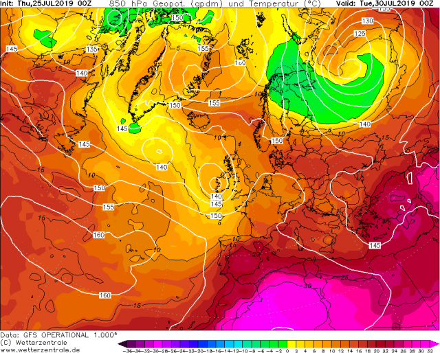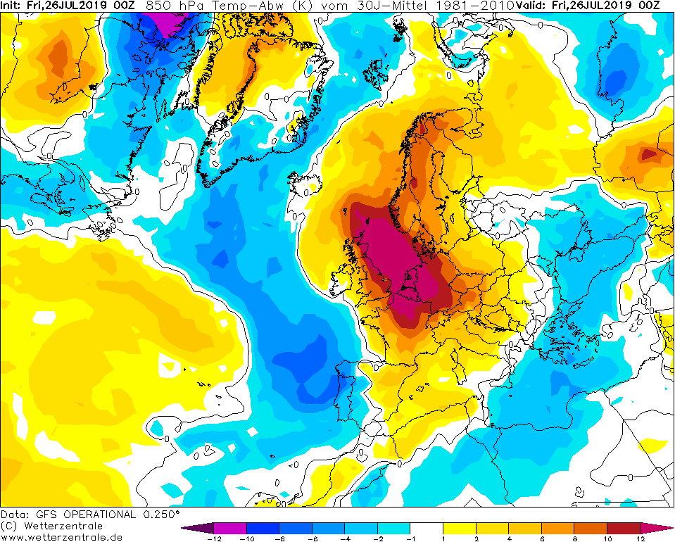 Eindrucksvoll wird dieser Umstand von einer Karte der Abweichung der Temperatur im 850-hPa-Niveau belegt: