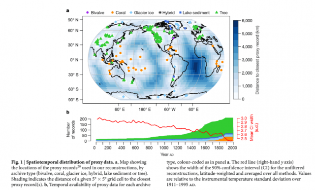 Die Ergebnisse der Studie von „Rapahel Neukom und sein[em] Team“, die in Nature Letter unter dem Titel „No evidence for globally coherent warm and cold periods over the preindustrial Commen Era“ veröffentlicht wurden, basieren auf den Daten der Pages 2K Datenbank, in der Ergebnisse unterschiedlicher Methoden, das vergangene Klima zu bestimmen, abgelegt sind, also die Ergebnisse aus der Untersuchung von Eisbohrkernen, aus der Analyse von Bäumen, Fluss- und See-Sedimenten, Gletschern und Korallenriffen. Der Datensatz ist ein Patchwork unterschiedlicher Erhebungsmethoden und somit auch unterschiedlicher Validität.