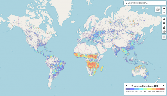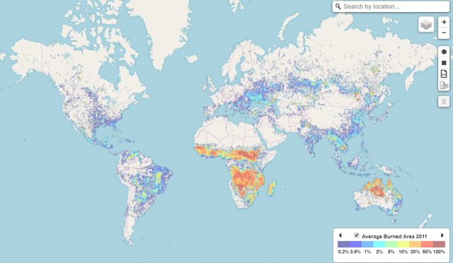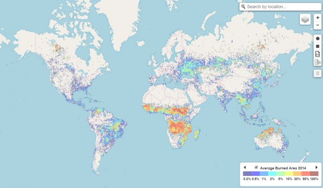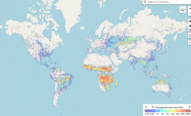 Wie man den ersten fünf Abbildungen entnehmen kann, waren Brände in jedem Jahr von 2010 bis 2014 in Zentralafrika häufiger als im Regenwald des Amazonas. Was hier brennt, kann man der folgenden Karte gut entnehmen: vornehmlich Wald.