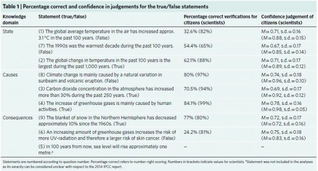 Vielleicht spielt das auch keine Rolle. Zumindest die Antwort auf einige Fragen ist jedoch in ihrer Masse beunruhigend. Nehmen wir zum Beispiel die Aussage (8): Climate change is mainly caused by a natural variation in sunbeam and volcanic eruption. (False). [Übersetzung der Verdeutlichung halber: Klimawandel wird hauptsächlich verursacht durch natürliche Variationen der Sonnenstrahlung und Vulkanausbrüche (falsch)]. 80% der Bürger und sogar 97% der „Wissenschaftler“ sollen die „richtige“ Antwort „falsch“ gegeben haben. (Mit „sollen gegeben haben“ will ich zum Ausdruck bringen, dass auch diese Zahlen vielleicht getürkt sind – vielleicht aber auch nicht). Folglich kann man die oben gestellte Frage nur so beantworten: Die Propaganda hat sich zu einem erschreckend hohen, wenngleich auch nicht überraschend hohen Ausmaß in den Köpfen der Befragten festgesetzt.
