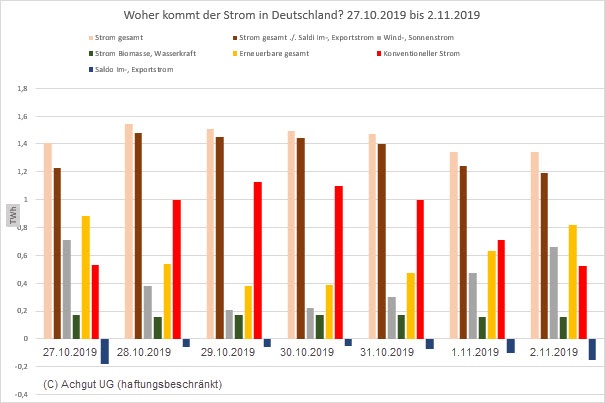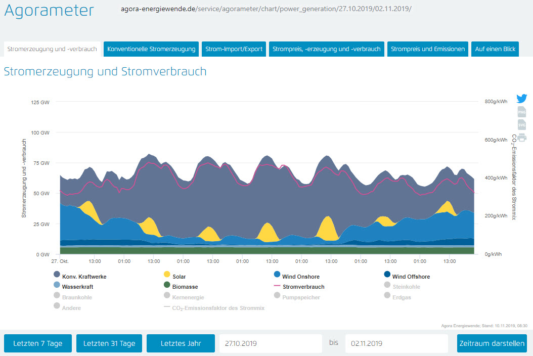 Donnerstag, 31.10.2019: Anteil Erneuerbare an Gesamtstromerzeugung 31,97 Prozent