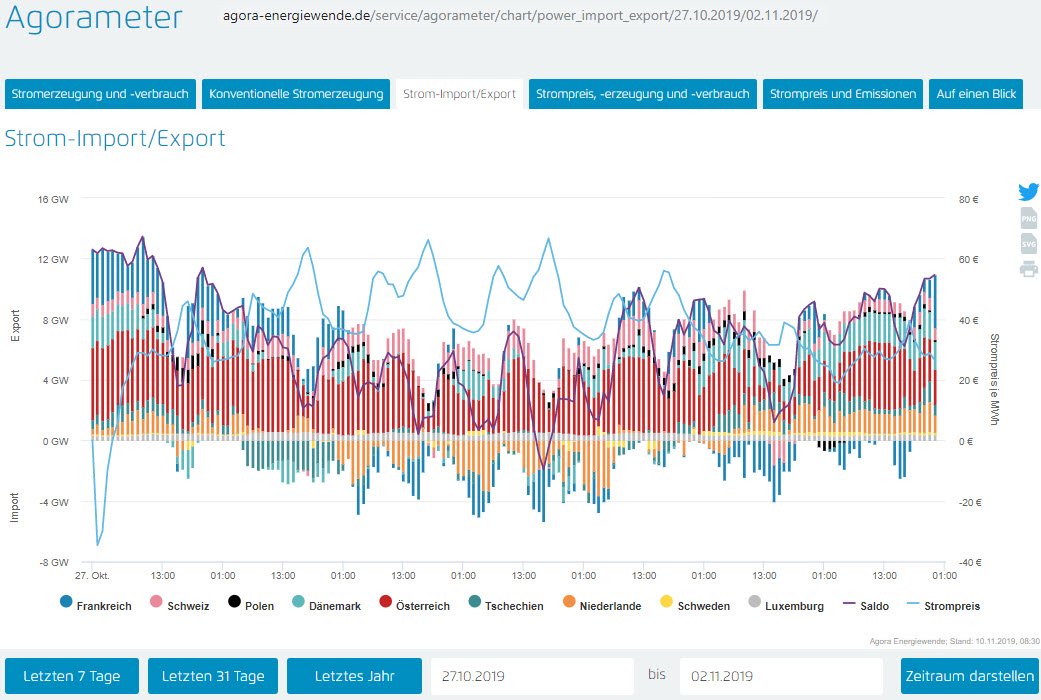 Die 44. Woche war zu Beginn und zum Ende windstark. Dazwischen gab es knapp 4 Tage Flaute. An zwei dieser Tage erzeugten die Kraftwerke der Erneuerbaren so wenig Strom, dass nicht mal eine Verfünffachung der installierten Leistung Wind- und Sonnenkraftwerke rechnerisch ausgereicht hätte, um den Bedarf Deutschlands zu decken. Am 29.10.2019 hätten trotz dieser exorbitanten theoretischen Mehrleistung 0,29 TWh Strom gefehlt. Da hätte sogar nicht mal eine volle Speicherfüllung des angedachten Großspeichers „Hambacher Loch“ ausgereicht, um die Lücke auszufüllen. Am 30.10.2019 fehlten 0,22 TWh. Da hätte der Großspeicher zumindest rechnerisch gereicht. Der war aber nun mal leer. Wegen des Vortags. Dieses Beispiel aus dem echten Leben zeigt, was starke Schwankungen, was hohe Volatilität im Bereich erneuerbar erzeugter Strom bedeutet. Zu den Im-/Exportwerten mehr in den Tagesanalysen. Wie immer hier die Tabelle mit den Detailzahlen der Energy-Charts und der daraus generierte Chart.