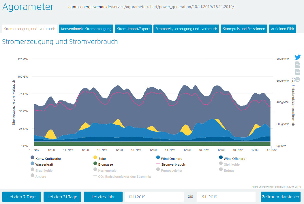 Sonntag, 10.11.2019: Anteil Erneuerbare an der Gesamtstromerzeugung 28,91 Prozent