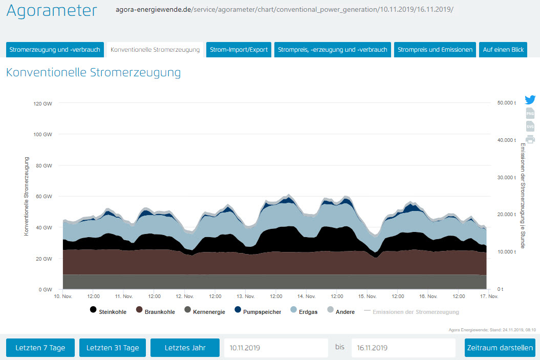Werfen wir einen Blick auf die Zusammensetzung des konventionell erzeugten Stroms nach Energieträgern. Braunkohlestrom und Strom aus Kernenergie bilden das Fundament der Stromerzeugung in dieser Woche, praktisch des ganzen bisherigen Jahres.