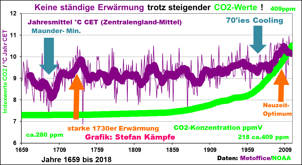Die Diskussion, ob oder wie stark atmosphärisches CO2 erwärmend wirkt, soll hier den Physikern überlassen bleiben. Aber vielleicht hilft ein Blick auf den Temperaturverlauf in Zentralengland, um zu erkennen, dass CO2 weder früher noch gegenwärtig der Hauptauslöser von Klimaschwankungen ist: