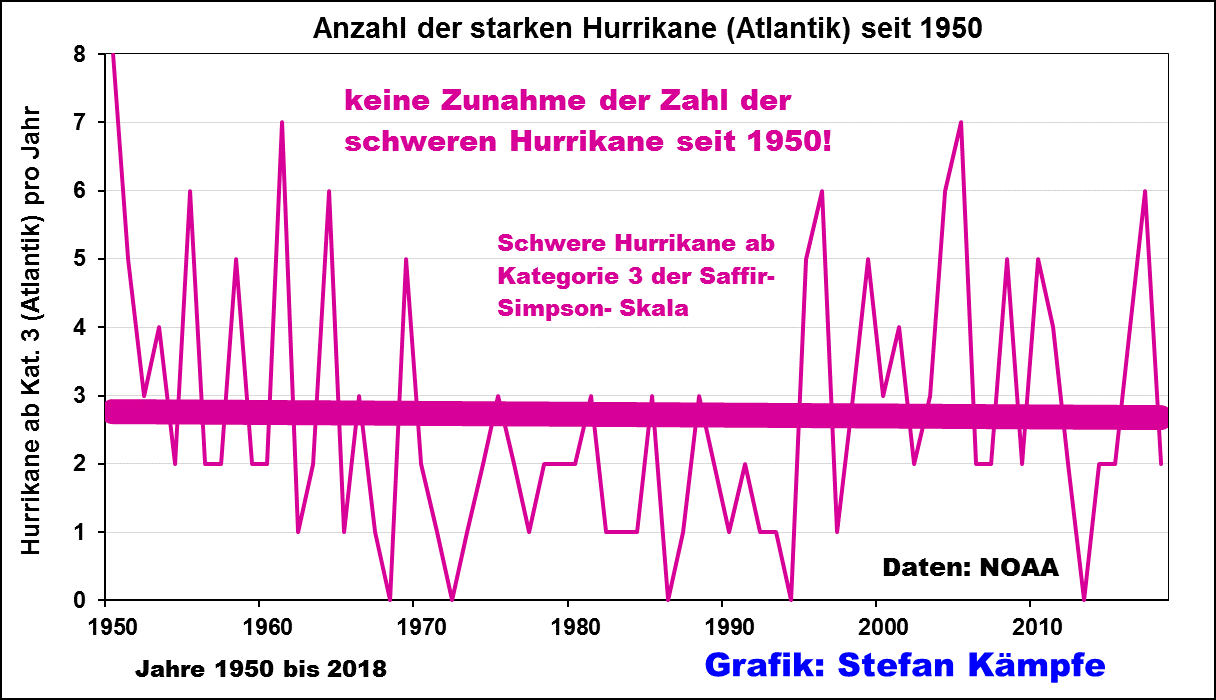 Abbildung 5: Die Anzahl der schweren Hurrikane (tropische Wirbelstürme des Atlantiks) nahm in den vergangenen gut 60 Jahren trotz „Erderwärmung“ nicht zu.