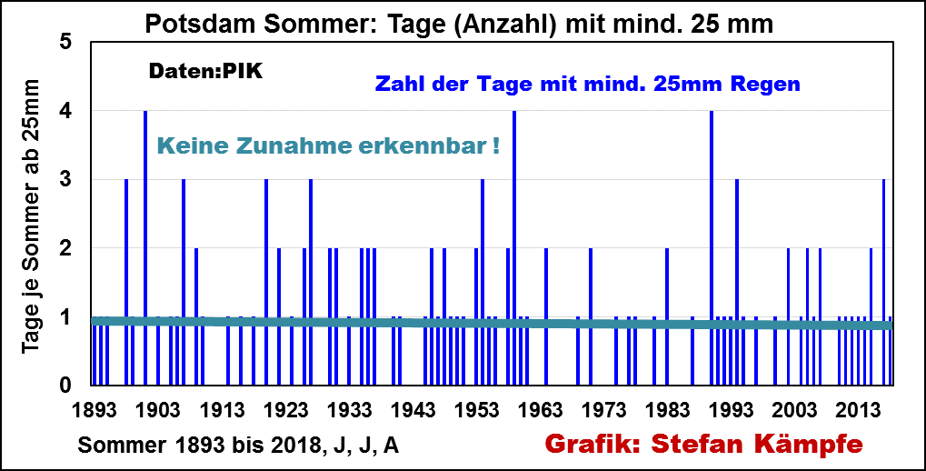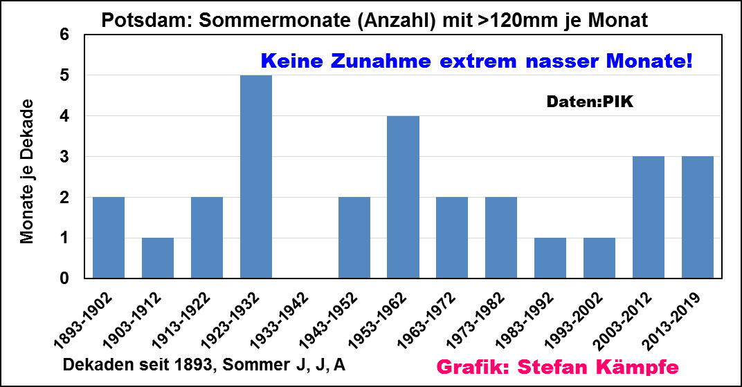 Abbildungen 8a bis 8c: Bislang häuften sich weder extrem trockene Sommermonate (8a, oben), noch extrem nasse (8b, Mitte), noch Starkregenereignisse im Sommer – dramatische Auswirkungen des Klimawandels sind nicht erkennbar.