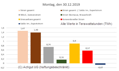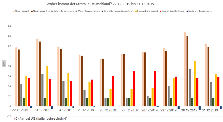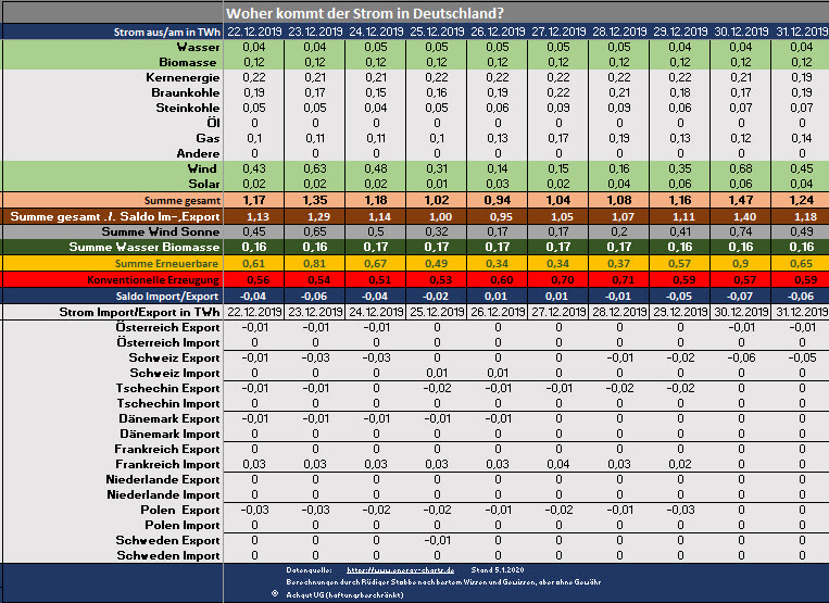 Die Detailzahlen zur Stromerzeugung der letzten 10 Tage des Jahres 2019 finden Sie in dieser Tabelle mit den Werten der Energy-Charts und dem daraus generierten Chart.