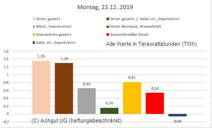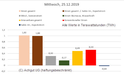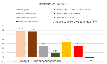 Der Heilige Abend: Wenig Strombedarf und eine zurückgehende Windstromerzeugung führen zu einem annähernd gleichen Im-/Exportbild wie am Montag. In der Nacht wird Strom mit Bonus verschenkt. Über Tag erholen sich die Preise. Die konventionellen Stromerzeuger erhöhen über Tag ihre Stromproduktion. Höchstpunkte sind jeweils der Mittag und der frühe Abend. Da, wo erfahrungsgemäß der meiste Strom des Tages benötigt wird.